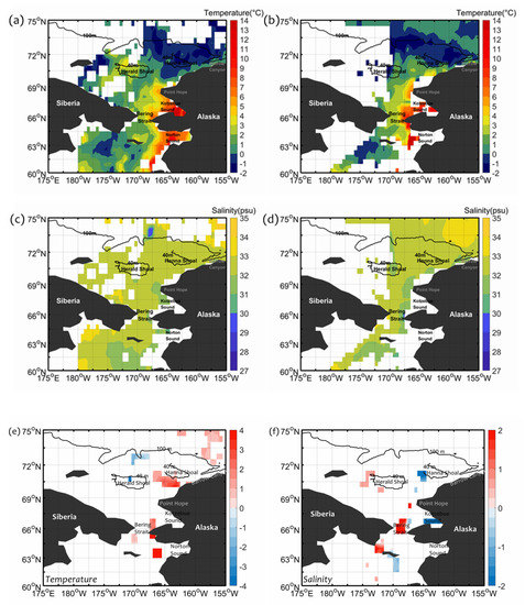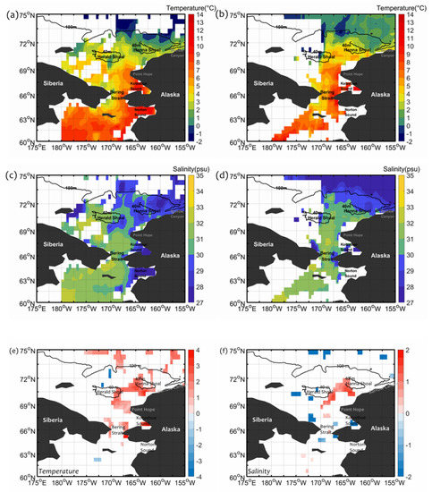 The warm PSW in the surface layer (T > 3–4 °C) extended further north after 1997; its edge was located at approximately 72° N, and approximately along 50 m isobaths (Figure 10a–d), whereas it was located at approximately 70° N before 1997. North of the warm water lies the melting water. The extension of the PSW has led to a significant warming and salting in the east of the Herald Shoal after 1997 (Figure 10e,f) because the salt and warm PSW replaces the fresh and cold melting water. The SST and SSS differences also show another remarkable warming and salinification phenomenon west of Point Hope, which may be due to the effect of the ACW. Only values passing the T-test (confidence levels: 95%) are shown in these difference maps (same in Figure 11 and Figure 12).