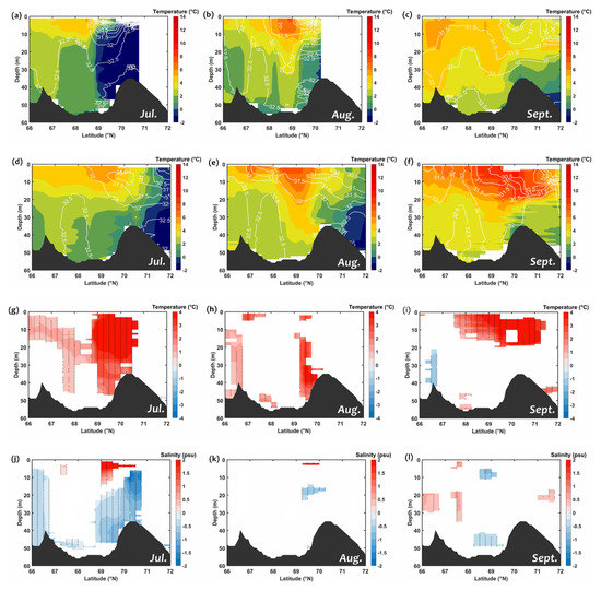 The difference in 95% confidence level shows that the temperature increased after 1997 each month (Figure 12g–i). The remarkable warming at the front near 69°–70° N in July was due to the advection of the PSW, and the warming in the upper layer (less than 20 m) in September was mainly due to the longer surface heating because of the earlier melting of the sea-ice cover after 1997. In July, salinity increased in the upper layer and decreased in the lower layer. In general, the changes in salinity were small in August and September along this meridional section (Figure 12j–l). The areas undergoing significant changes are small in August, especially in salinity difference maps. In August and September, PSW already occupied almost the whole shelf during the two periods, and the salinity of the PSW is more conservative than its temperature. The advection effect of the PSW become less important than surface forcing (wind mixing and surface heating) in August and September.