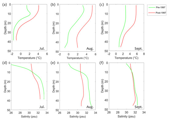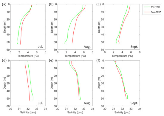 The regional average (a–c) T and (d–f) S profiles of the southern Chukchi shelf from July to September. The green and red lines represent the average values of the pre- and post-1997 periods, respectively.