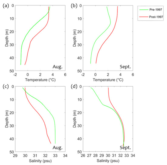 The regional average (a,b) T and (c,d) S profiles of the northern Chukchi shelf in August and September. The green and red lines represent the average values of the pre- and post-1997 periods, respectively.