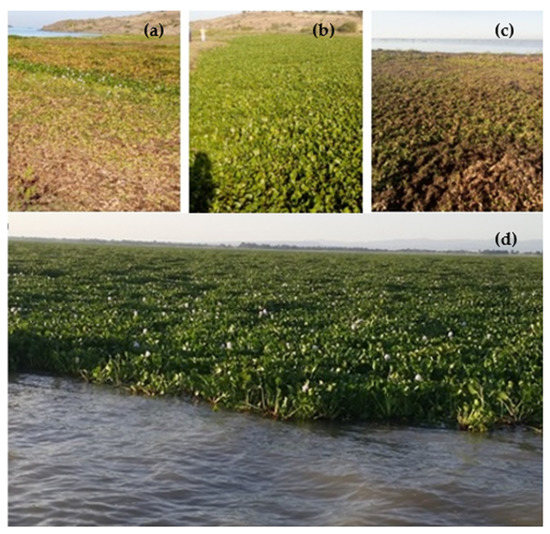 Lakes connected to rivers have a long inundation period and the morphology of water hyacinth responds to the annual lake-level fluctuations [42]. Previous studies showed that the water level of Lake Tana fluctuates annually and seasonally in relation to changes in precipitation and inflows from the tributary rivers [43]. A previous study [44] showed that the Normalized Difference Vegetation Index (NDVI) of water hyacinth ranges between 0.81 and 0.94 and its value was low in spring (April and May) and rapidly increased after June. NDVI is an index that is dimensionless, developed in the 1970s, and it estimates photosynthetic active biomass based on the difference and sum of reflectance in spectral bands of red and near-infrared (NIR) [44].