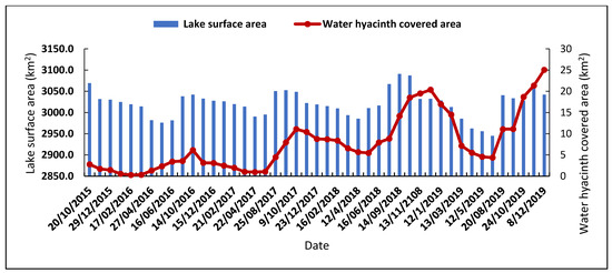 Monthly graphical presentation of water hyacinth covered area and lake surface area since 2015.