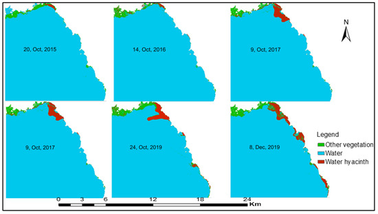 The classification of images was done using four classes in the dry season (January to April) and the pre-rainy season (May and June) (water, water hyacinth, other vegetation, and bare lands) and three classes in the rainy season (July, August) and post-rainy season (September, October, November, and December) (water, water hyacinth, other vegetation). The water class includes both turbid and clear water. The other vegetation class includes all vegetation except water hyacinth and bare land includes sediment deposition, cultivated land and any rocky land surfaces. The main focus of this study was to estimate the area of the lake covered by water hyacinth in each given month. The main challenge was getting cloud-free imagery in 2016 (July and August), 2017 (June), 2018 (July) and 2019 (June), and, as the result, these months were not considered during our classification. To evaluate the rate of expansion of water hyacinth, especially the maximum annual expansion rate, a simple calculation was made by considering the areal coverages of the current and the previous year. The classification was focused only on the lake and it did not include the water hyacinth in the flood plain and the surrounding wetlands. The annual expansion rate of the water hyacinth was calculated by comparing the maximum water hyacinth coverage of successive years for example for 2016: