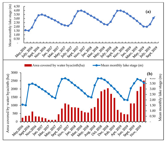 Graphical presentation of the mean monthly lake stage (a) and the correlation between area covered by water hyacinth and mean monthly lake stage (b) from 2016–2019.