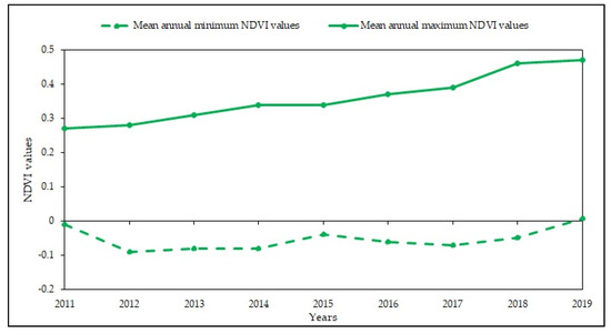 Spatial annual maximum and minimum values of the Normalized Difference Vegetation Index (NDVI) on Lake Tana starting from January 2011 to November 2019.