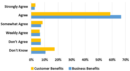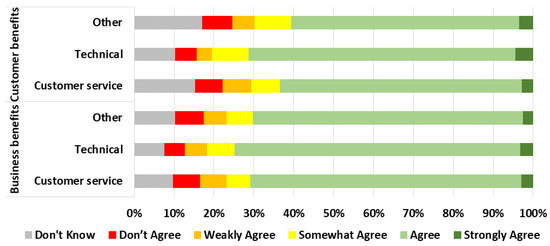 The level of agreement scores by the job role of staff is shown in Figure 4. Technical staff were more likely to provide opinions and, unexpectedly, 15% of the time, experts in customer service job roles did not provide an opinion for customer benefits. However, after excluding the ‘do not know’ responses, the levels of agreement were consistent across benefits regardless of the job role.