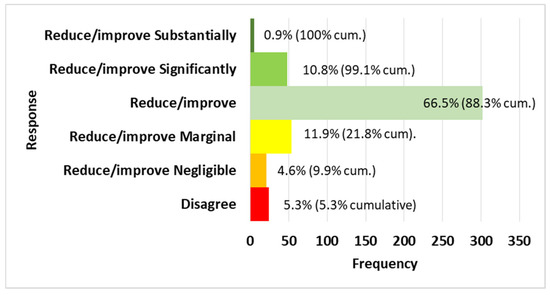 The other 299 expert assessments had a positive agreement level but no benefit value, for example, the simple response “yes”. These were considered as being ‘missing at random’ and three methods for imputing their value [70,76,77,78] were considered—use of the mode, proportionate, and surrogate. The surrogate method was adopted as use of mode biased the frequencies due to the number of responses involved, and the proportionate method had no impact on the relative frequencies. The use of the Agreement Level score was considered a suitable surrogate as it included a level of enthusiasm as part of the agreement. That is, weak agreement (1) could be equated to negligible benefit value (1), etc. Assessments with the fourth agreement level group, strong agreement, were distributed to benefit levels 4 and 5 proportionately based on the overall levels of benefit levels 4 and 5. The confusion matrix (see Table 7) shows the number of responses by agreement level for each of the benefit value levels with benefit levels 4 and 5 grouped to enable comparison to the highest agreement level, 4.