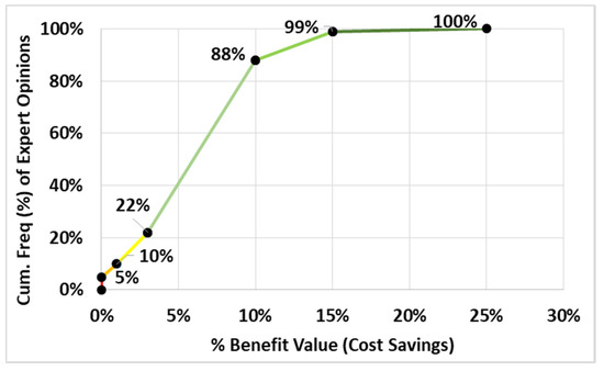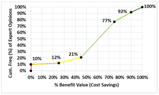 Based on the quantification table (see Table 9), a transformation from the cumulative frequency of expected %-benefit value for the charges/operational costs context has been developed (see Figure 9). The cumulative frequency chart is shown (see Figure 10). Based on the cumulative frequency, 10% of experts would score a benefit of 0%, another 2% (>10, <=12%) of experts would score a negligible benefit of between 0% and < 25%, etc.