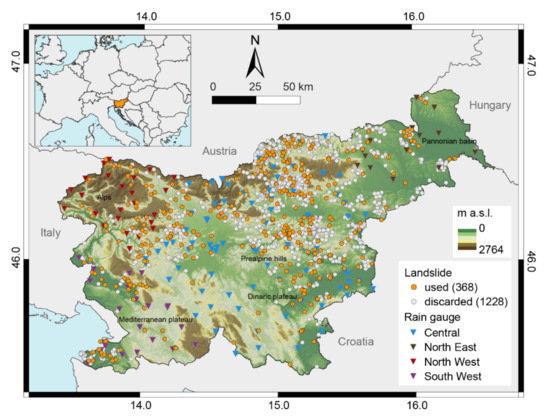 Location of Slovenia, with indication of the rain gauges used to reconstruct the rainfall events responsible for the failures, classified into four geographical areas related to rainfall characteristics, and of the landslides included in the analyzed catalogue. The landslides used for threshold calculations are indicated with orange dots.