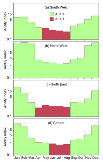 Calculated aridity index for individual regions: (a) South West; (b) North West; (c) North East; (d) Central region. Green and red areas indicate the cold/rainy and the warm/dry months, respectively.