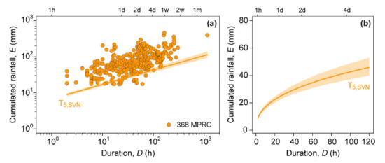 (a) Log-log plot with the cumulated event rainfall—duration ED, conditions that triggered landslides in Slovenia and the corresponding 5% ED threshold (T5,SVN). (b) T5,SVN threshold in the range 1 h ≤ D ≤ 120 h, in linear coordinates. The shaded areas represent the threshold uncertainty.