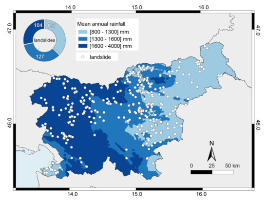 To investigate the role of the rainfall regime for the landslide triggering conditions in Slovenia, we used data on mean annual rainfall (MAR) provided by ARSO [42], which were divided into three classes. Figure 4 shows that the eastern part of Slovenia (32% of the total national territory) is characterized by low values of MAR (800 ≤ MAR ≤ 1300 mm), the central part (30%) by medium values (1300 < MAR ≤ 1600 mm) and the western part (38%) by high values (1600 < MAR ≤ 4000 mm). The number of landslides in the region characterized by a low, medium and high MAR class is 137, 127 and 104, respectively. The lowest density of landslides (one landslide every 74 km2) is found in the area with high MAR values, while the other two areas are characterized by a similarly higher value of landslide density (one every 47 km2).