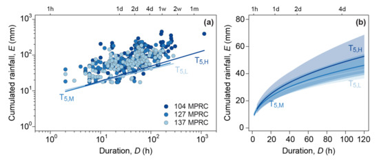 (a) Log-log plot with the ED (cumulated event rainfall—duration) conditions that triggered landslides in Slovenia classified according to three classes of mean annual rainfall (MAR) and corresponding 5% ED thresholds (T5,H, T5,M, T5,L). (b) Same thresholds and related uncertainties (shaded areas) in the range 1 h ≤ D ≤ 120 h, in linear coordinates. Legend: L, 800 mm ≤ MAR ≤ 1300 mm; M, 1300 mm < MAR ≤ 1600 mm; H, 1600 mm < MAR ≤ 4000 mm.