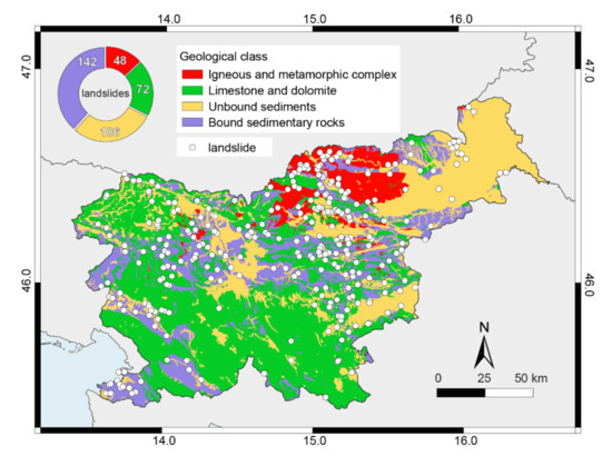 Subdivision of Slovenia into four main lithological classes based on the engineering geological map by Ribičič et al. [49], with indication of the landslides used in the analysis. The donut chart shows the number of landslides in each class.