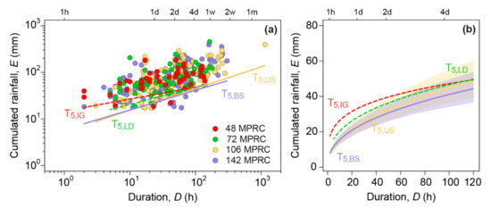 Figure 7a shows the ED conditions in each lithology class in log–log coordinates with the corresponding 5% NEP thresholds, T5,IG, T5,LD, T5,US and T5,BS (Table 1). The same thresholds are shown in linear coordinates in Figure 7b, with the range of duration (D) varying from 1 to 120 h. Due to the small number of conditions for classes IG and LD, the uncertainties are too high, and the thresholds cannot be considered significant for these classes [39,47]. Nevertheless, they indicate the differences in the triggering conditions, with the IG class having the highest threshold and bound sedimentary rocks having the lowest. For obtaining more reliable thresholds, more empirical points are needed. However, a clear distinction in the minimum triggering conditions between landslides that occurred in sedimentary rocks and those that occurred in dolomite, limestone, igneous and metamorphic complexes can be currently observed.
