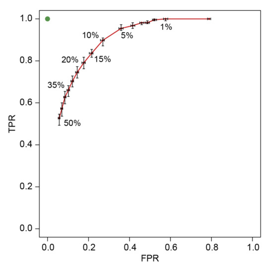 The validation of the national thresholds was based on two subsets of data: (i) a calibration set containing 70% of all reconstructed rainfall conditions (258), and (ii) a validation set containing the remaining 30% (110). The subsets were randomly selected 100 times. In addition, all those rainfall conditions that (presumably) did not cause landslides in the considered period were also reconstructed. The validation was performed 100 times, each time resulting differently; the number of conditions was always the same. The thresholds at different NEPs, calculated using the MRPC in the calibration set, are compared with the MPRC in the validation set and the rainfall conditions that did not trigger landslides. Therefore, 100 contingency tables were determined [33,51], reporting true positives (TP, i.e., landslide-triggering rainfall conditions predicted by the thresholds), false positive (FP, i.e., rainfall conditions not resulting in landslides incorrectly classified as landslide-triggering), true negatives (TN, i.e., rainfall conditions not resulting in landslides not predicted by the thresholds) and false negatives (FN, i.e., landslide-triggering rainfall conditions located below the threshold). Furthermore, three skill scores could be calculated: the true positive rate, i.e., TPR = TP/(TP + FN); the false positive rate, i.e., FPR = FP/(FP + TN); and the true skill statistics, i.e., TSS = TPR − FPR. Moreover, the FPR and TPR values were used to draw the receiver operating characteristic (ROC) curve (Figure 8). The best prediction is achieved when TPR = 1 (all observed landslides correctly detected) and FPR = 0 (no false positives) and is represented by the upper left green point in Figure 8 (best prediction point). The threshold which results closest to the best prediction point is assumed to be optimal.