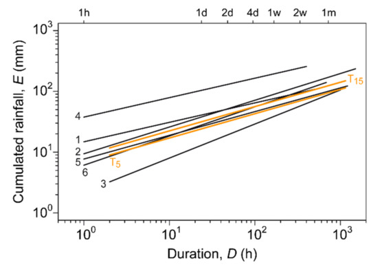 The definition of empirical rainfall thresholds is often affected by subjective criteria, such as the definition of the rainfall events responsible for landslide triggering, and by uncertainties, such as the quality of rainfall data and the accuracy of the location and timing of landslide occurrences [32,33]. To avoid any subjective bias in the results, Melillo et al. [34,35] proposed an algorithm for the automatic calculation of thresholds for rainfall-induced landslides, which was improved and implemented in a software tool (CTRL-T, Calculation of Thresholds for Rainfall-induced Landslides Tool) [32]. The tool uses objective, standardized criteria for the automatic reconstruction of landslide-triggering rainfall conditions, based on historical rainfall records and landslide occurrence dates. It was applied by several authors in diverse environments in Italy [32,36], India [37] and Bhutan [38].