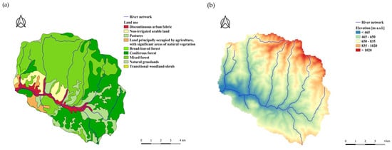 The selected case study is the Grajcarek river catchments (coordinates for cross-section Szczawnica: 49°25′22″ N 20°28′58″ E). It is located in the Carpathian part of the upper Vistula river catchment, in Poland. The catchment area is 86 km2. The length of the main watercourse to the outlet cross-section is 15.0 km. The average catchment slope is 8%. The density of the river network is 0.70 km−1. This information was derived using a Digital Elevation Model (DEM) provided by USGS—United States Geological Survey, with a grid resolution of about 25 m. Based on the Hydrographic Division Map of Poland 2010 and on the Corine Land Cover 2018 database, the following forms of land uses were identified together with the percentage of the catchment area respectively occupied. Loose urban buildings (4.5%), arable lands without irrigation (5.1%), meadows and pastures (14.4%), areas occupied mainly by agriculture with a high proportion of natural vegetation (2.1%), coniferous forests (29.8%), mixed forests (43.4%), and deciduous forests (0.2%). The case study is dominated by poorly permeable and impermeable soils. The average annual rainfall in the catchment area exceeds 765 mm. The average annual temperature is 6.8 °C. Figure 1 shows the land use and the topography of the catchment.