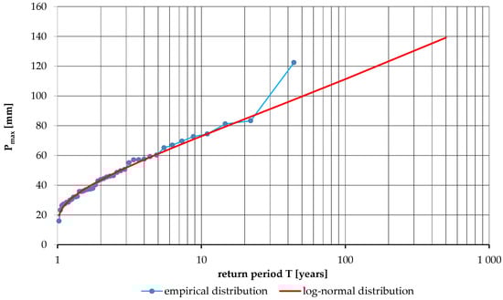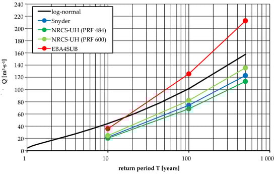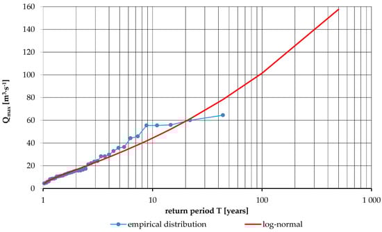 In this study, it was assumed that the maximum flow with a specific frequency (QT) is caused by the occurrence of rainfall with the same frequency [22]. The QT flows were determined in order to assess the quality of the hydrological rainfall-runoff models. The tests were performed for the frequencies related to the return periods of 500, 100, and 10 years. The calculations were performed applying the log-normal distribution, which is described as [23]: