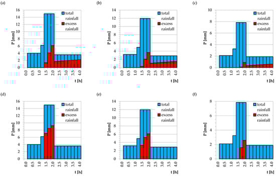 Figure 4. Excess rainfall hyetographs against the background of the total rainfall determined by the following methods: (a) NRCS-CN for return period 500 years; (b) NRCS-CN for return period 100 years; (c) NRCS-CN for return period 10 years; (d) CN4GA for return period 500 years; (e) CN4GA for return period 100 years; (f) CN4GA for return period 10 years.