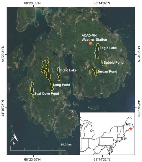 The lakes in this study are located in Acadia National Park in Maine, USA (Figure 1; Table 1). Within the 35,000-acre park, lakes cover approximately 2600 acres. Granite dominates the landscape throughout the park and soils in Acadia are derived from granite and schist tills []. Spruce-fir forests, representative of the northern boreal forest, cover much of the landscape in Acadia with stands of oak, maple, and beech, typical of the eastern deciduous forest, dominant in some areas that were burned in a fire in 1947.