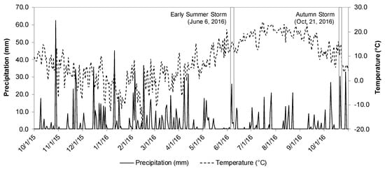 We sampled two events, one in June and one in October, representing an early summer rain event and an autumn rain event. Precipitation and air temperature data were collected from the ACAD-MH weather station. Hourly climate data were converted to daily climate data from 1 October 2015 to 31 October 2016. These events had 25.9 mm of rain within 24 h in June and 30.2 mm of rain in 24 h in October (Figure 2; Table 2). The goal of the study was to evaluate the response of extreme precipitation events, which is typically defined as a set amount in a 24-h period, i.e., [,,,] and others, or events that fall into the highest 1–2% of all precipitation events for a given year or range of years. While these rain amounts may not be considered extreme rain events, these storms still constituted the top rain events for the year, falling into the top 2.2% of highest rainstorms between 1 May 2016 and 31 October 2016.