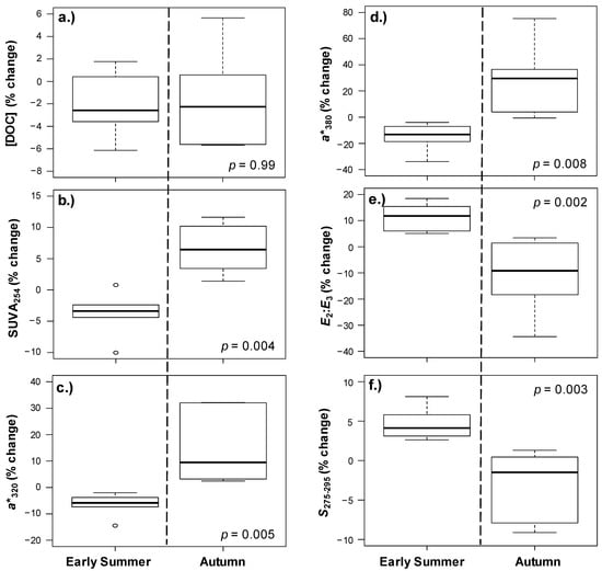 Responses of the six study lakes for (a) [DOC], (b) SUVA254, (c) a*320, (d) a*380, (e) E2:E3, and (f) S275–295 of Early Summer versus Autumn storms represented by percent change from Pre to P2 (n = 6). The p values indicate differences between Early Summer and Autumn.