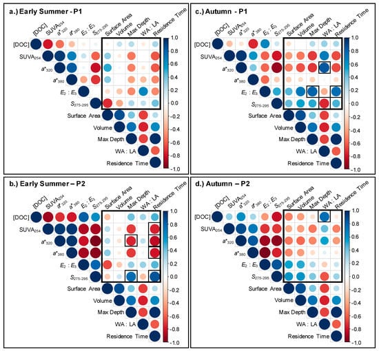 Correlations between the percent change of [DOC], SUVA254, a*320, a*380, E2:E3, S275–295 and select lake characteristics (outlined in the larger boxes) during the Early Summer for (a) P1 and (b) P2 and Autumn (c) P1 and (d) P2 storm samplings. Bold borders on cells (within the larger boxes) indicate significant relationships (p < 0.10) between DOC metrics and lake characteristics. Larger circles indicate stronger correlations, red circles indicate negative correlations and blue circles indicate positive correlations. WA:LA indicates the ratio of watershed area to lake area.