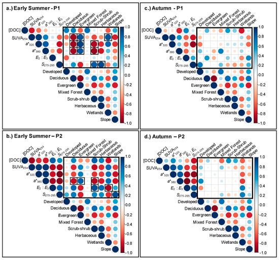 Correlations between the percent change of [DOC], SUVA254, a*320, a*380, E2:E3, and S275–295 and land cover (outlined in the larger boxes) during the Early Summer for (a) P1 and (b) P2 and Autumn (c) P1 and (d) P2 storm samplings. Bold borders on cells (within the larger boxes) indicate significant relationships (p < 0.05) between changes in DOC metrics and land cover. Larger circles indicate stronger correlations, red circles indicate negative correlations and blue circles indicate positive correlations.