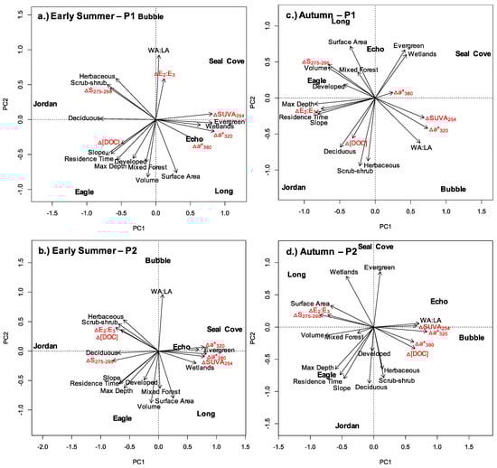 PCA plot illustrating changes between the percent change of [DOC], SUVA254, a*320, a*380, E2:E3, and S275–295 and environmental variables (lake characteristics land cover) during the Early Summer for (a) P1 and (b) P2 and Autumn (c) P1 and (d) P2 storm samplings. DOC metrics are indicated by red font, environmental variables are in black font.