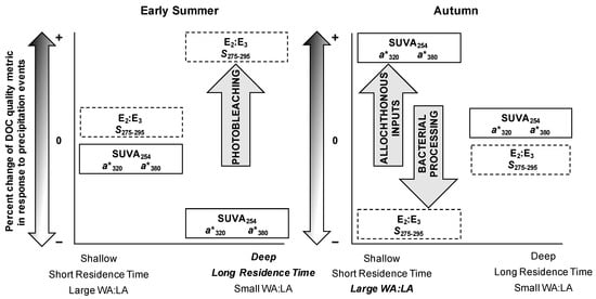 During the early summer storm, land cover is more highly correlated with changes in DOC quality metrics, whereas it does not play a significant role in the autumn. The negative correlation between changes in SUVA254, a*320, and a*380 and deciduous cover corresponds to a strong negative response or decrease in these DOC quality metrics in response to storm events. Lake watersheds with more deciduous cover and less evergreen cover have a greater negative response in DOC quality metrics to storm events than lake watersheds with more evergreen cover in the early summer. Measured DOC concentration is often higher in soils under coniferous forests than DOC measured in soils under deciduous forests []. Additionally, the percent of deciduous cover was low across all watersheds, therefore in the autumn, there was likely a negligible effect of deciduous forest similar to boreal streams in northern Sweden, where the presence of deciduous forest had a negligible effect on DOC during the wet period []. Thus, in the autumn storm, the size of the watershed contributes to larger inputs of terrestrial matter or allochthonous material, therefore WA:LA is more influential to changes in DOC quality as opposed to forest type. In the early summer storm, the positive correlation between changes in S275–295 and slope support the larger positive response of DOC quality metrics in the deep lakes with higher residence time, as these lakes’ watersheds also have the steepest slopes. Wetlands often contribute to changing DOC in lakes [,]. Surprisingly, wetlands and DOC concentration are negatively correlated in the autumn, however changes in DOC quality were variable and, while not significant in this study, DOC quality may be more indicative of wetland influence on lakes. Relationships between DOC quality and land cover contribute to the explanation of seasonal variability in lake response to storm events.