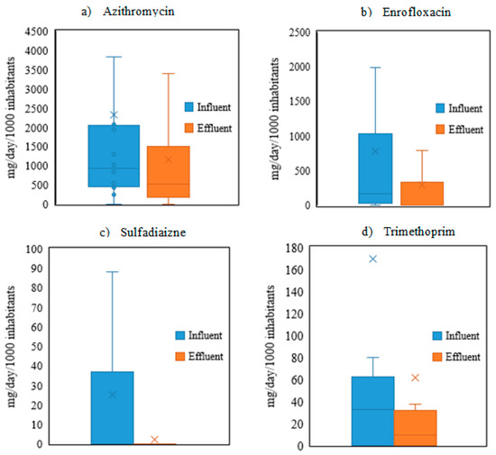- The mass loadings of the antibiotics ranged from 11,332 mg/day·1000 inhabitants to undetectable levels. Azithromycin had the highest mass loadings, followed by enrofloxacin, trimethoprim, sulfadiazine and amoxicillin.