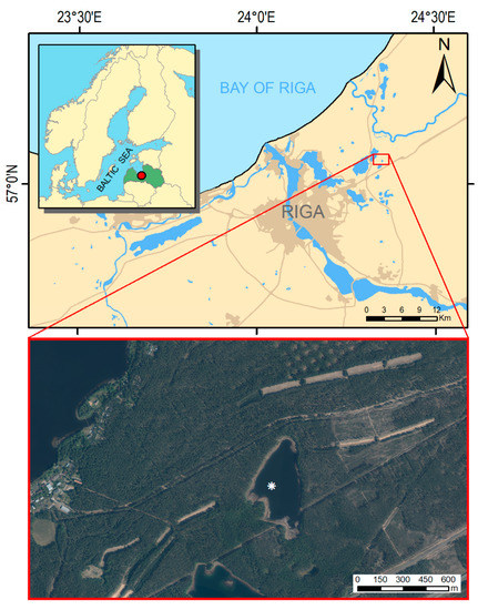 Lake Sekšu (57°03′ N, 24°35′ E, Figure 1) is a small (surface area 7.9 ha), shallow (the average and maximum depth is 2.5 m and 6 m, respectively) lake at an elevation of 2.5 m a.s.l., located in the vicinity of the capital city of Riga, central Latvia, Northern Europe [11,12]. The average annual air temperature (1981–2010) in areas close to the Baltic Sea coast is +6.8 to +7.4 °C. July is the warmest month of the year, with an average air temperature +17.4 °C (average maximum +22.3 °C). The coldest month of the year is February, with an average air temperature of −3.7 °C. The annual rainfall is 692 mm. According to the data on climate change, the air temperature and precipitation in the area are increasing [13].