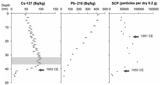 Downcore distribution of 137Cs and 210Pb activities as well as spheroidal carbonaceous particles (SCP) concentrations in the Lake Sekšu topmost sediments. The grey shaded area on the caesium diagram indicates time period 1956–1965 CE.
