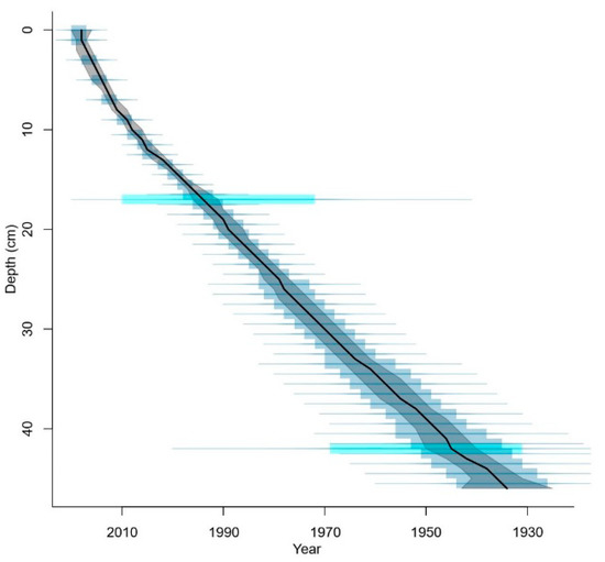 However, the excess 210Pb activities decrease regularly with mass depth, which demonstrates no significant disturbance of the sediment column and relatively stable mass accumulation rates. Thus, we used the CFCS (Constant Flux Constant Sedimentation) model to calculate the mean value of the mass accumulation rate (MAR) for the entire core. The mean MAR value is 34.5 ± 2.2 mg/cm2/yr and allows us to estimate a maximum age of 84 ± 5 yrs (1935 ± 5) at a 45.5 cm sediment depth. The age of the depth interval with the greatest 137Cs activities (37–32 cm) is 1956–1965 according to the CFCS model, which is consistent with global fallout history. This comparison suggests that the lack of a Chernobyl peak is related to 137Cs migration within the sediment column rather than physical sediment mixing.