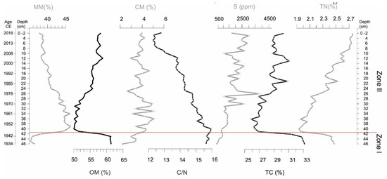 The relative organic matter (OM), total carbon (TC), and total nitrogen (TN) content show high values in this time period (Figure 4). The OM is around 61%, while TC is around 32%, and TN is around 2.5%. The C/N value, expressed as the atomic ratio, is around 15.7. The sulfur (S) content is approximately 500 ppm. The relative minerogenic matter (MM) (36%) displays the lowest values, while approximately 3.5% is carbonate matter (CM).