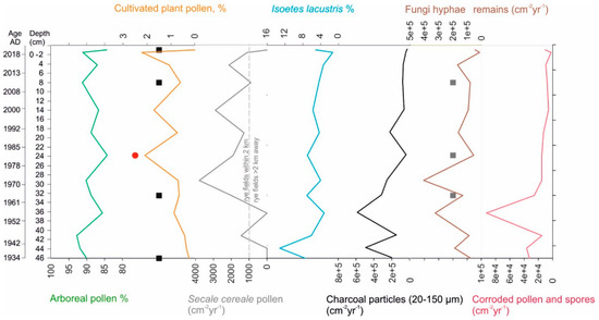 There is no significant change in surrounding vegetation before or after the pipe installation. The vegetation includes the stable dominance of pine (Pinus), birch (Betula), spruce (Picea), and alder (Alnus) over the studied period (Figure 5). The presence of conifer stomata in the lake sediment supports local abundance of spruce and pine. Although, the surrounding landscape is forested, there is continuous evidence of human-activities in the vicinity. For instance, the presence of pollen of flax (Linum), rye (Secale cereale), barley (Hordeum), and wheat/oat (Triticum/Avena) is a direct indication of agricultural practices. Our results also underline that there have not been agricultural fields directly at the Sekšu lake shores, but only further away, as evidenced by the high (nearly 85–90%) forest pollen component in the landscape. It is interesting that the rye pollen accumulation rates above 1000 cm−2 year−1 (Figure 6) point to cereal fields within a 2 km radius of Lake Sekšu [53,54]. Based on USSR topographic maps from the time period of 1941–1991, the cereal fields could be present in the northwest and east of the Sekšu Lake where pastoral activities have also been evident. It is, however, possible that the high concentration of rye pollen can be partially a result of soil erosion and water pumping (enlarging the pollen source area outside the watershed) into the Lake Sekšu. This assumption is further supported by a strong increase of fungi hyphae and corroded pollen grains.