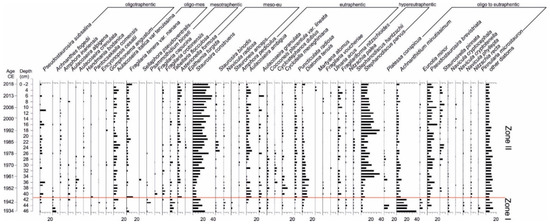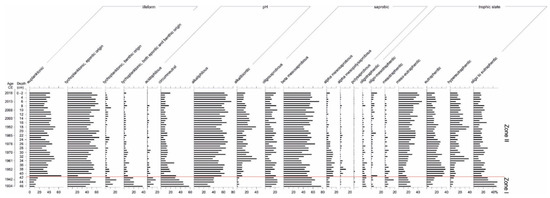 This zone was characterized by the dominance of tychoplanktonic taxa, especially Staurosira construens and Achnanthidium minutissimum (Figure 8). In terms of pH, circumneutral taxa dominated. At the beginning of the phase, we observed an increase in alkaliphilous diatoms. The analysis of saprobic preferences revealed the domination of β-mesosaprobous diatoms. In terms of its trophic state, a high proportion of oligo to eutraphentic taxa was observed. The TP reconstruction remained low, between 21.43–57.66 µg L−1 (Figure 11).
