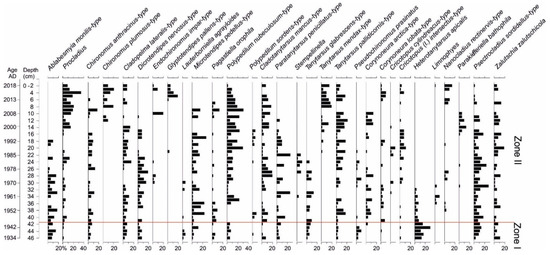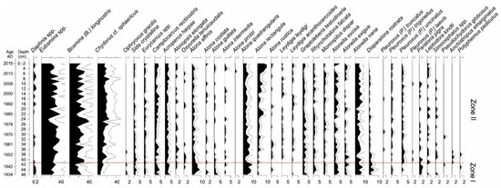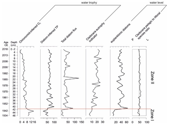 The oldest available investigations from 1924 report a transparency of 5.8 m in the middle of June [60], i.e., almost throughout the lake. It was also reported that Lake Sekšu is one of the 14 lakes located in the vicinity of Latvia’s capital city, Riga, that are Lobelia–Isoëtes population dominated lakes [66]. At the beginning of 20 century, there were at least three species typical for Lobelia–Isoëtes lakes found in Lake Sekšu—L. dortmanna, Isoëtes lacustris, and Juncus bulbosus [67]. Our research revealed the presence and high share of lake quillwort pollen Isoëtes lacustris, as well as Cladocera species Ophryoxus gracilis, around 1935 (Figure 9). Ophyroxus gracilis is a species characteristic of deep, transparent lakes, indicating low/moderate trophy [64,68]. Flössner [49] considers O. gracilis a species typical for Lobelia–Isoëtes lakes.
