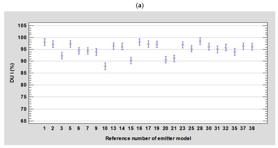At the end, in general, the DU values decreased in relation to the initial values, and significant statistical differences were found between the different emitter models (Figure 4). Amongst the 38 tested emitter models, five of them got a DU of less than 85%, and only seven models had a DU greater than 95%.