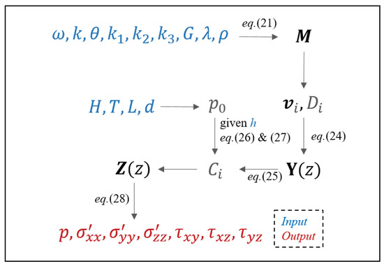 where indicates the undetermined constants for a particular solution, which can be determined through appropriate boundary conditions. The solution of Equation (24) contains displacement functions and their derivatives, which are useful for calculating the effective stresses , where , and . According to the constitutive law, as shown in Equation (4), the effective stresses can be expressed in terms of displacement functions and their derivatives through the following transformation: