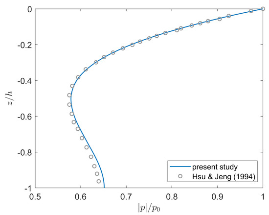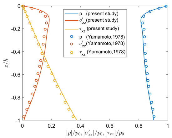 To verify the three-dimensional anisotropic seabed response for the dynamic form, the present solution was compared with two benchmark analytical solutions considering QS approximation: the two-dimensional solutions of Yamamoto [15] and the three-dimensional solution of Hsu and Jeng [18]. It is noted that these two solutions were used for verification in many previous studies [18,22,25]. The solution of Yamamoto assumed isotropic permeability in the seabed () [15], while that of Hsu and Jeng considered anisotropic permeability and presented the result of the horizontal transverse isotropic seabed () [18]. Table 1 lists the fixed parameters used for the following verification and results in the next section. The other parameters for each case, including the seabed thickness h, soil permeability , water depth d, wavelength L, wave period T, wave height H, and wave direction , will be introduced later.