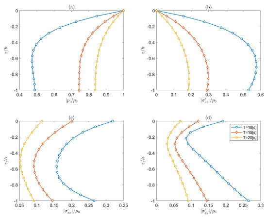 Considering that waves propagate in direction , three wave periods, , , and , were selected for representing the range of wave conditions from short wave to long wave. The corresponding wavelengths were for , for , and for , based on the linear wave theory. The anisotropic permeability was set as , , and vertical permeability . Figure 4 demonstrates the amplitude profiles of pore pressure and effective stresses for different wave periods. In Figure 4a,b, the amplitude of pore pressure decreases with depth, while that of vertical effective stress increases, and shorter waves have more reduction of and increment of , as a higher frequency of the loading wave implied a rapid interaction between the soil and pore flow. A similar phenomenon was observed by Zhou et al. [29]. For longer waves and , decreased monotonically, and the minimum of was on the bottom. For shorter waves , the minimum occurred at the depth . On the other hand, the maximum of occurred at the upper soil layer for shorter waves. For , , and , the maximum of was , , and , which occurred at the depths , , and , respectively. When a periodic wave propagated, the soil tended to expand under a wave crest and contract under a wave trough. The soil contraction was accompanied with the build-up of excess pore pressure, particularly at the depth of a minimum . For fine sands with low permeability, an excess pore pressure may build up on the upper soil layer to cause a risk of liquefaction. The amplitude profiles of horizontal effective stress for different wave periods are shown in Figure 4c, and that of is shown in Figure 4d. Both indicated that shorter waves had a greater magnitude of amplitude, and the minimum occurred in the middle layer. The maximum of occurred at the seabed surface, while that of appeared on the seabed bottom. In general, the amplitude profile of the seabed response for shorter waves varied dramatically with the depth, as compared to the longer ones, and the discrepancy between the profiles of the two shorter waves was much greater.