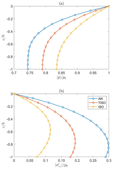 Comparison of (a) pore pressure p and (b) vertical effective stress for anisotropic (AN), transverse isotropic (TISO), and isotropic (ISO) permeabilities (AN, TISO, and ISO correspond respectively to Cases 2, 8, and 11).