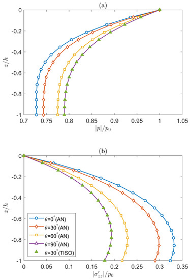 Comparison of (a) pore pressure p and (b) vertical effective stress for different wave directions between AN and TISO permeabilities (for the AN cases, , and 90° correspond respectively to Cases 4, 2, 5, and 6; the TISO of corresponds to Case 8).
