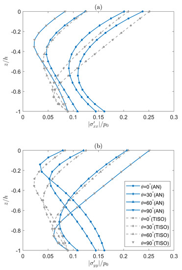Comparison of horizontal effective stresses (a) and (b) for different wave directions between AN and TISO permeabilities (for the AN cases, , and 90° correspond respectively to Cases 4, 2, 5, and 6; for the TISO cases, , and 90° correspond respectively to Cases 7, 8, 9, and 10).