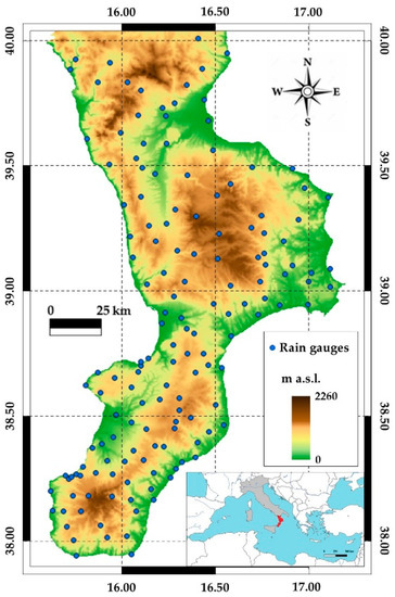 The authors used the 20-min data series until 2015, downloaded from the website of the Multi Risk Functional Center of Calabria region (www.cfd.calabria.it). The whole network consists of 155 rain gauges (Figure 1) and the density is about 1 rain gauge in 100 km2.