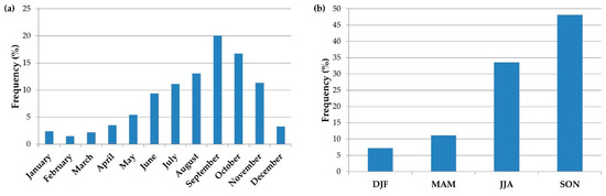 Monthly (a) and seasonal (b) frequency histograms for the investigated events.