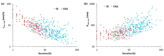 Concerning visual inspection, it is expected that convective events are characterized by intense and localized peaks which are spatially separated by areas without precipitation [46,47,48], while synoptic events usually present a more uniform rainfall field. Consequently, a first level for regrouping was based on the shape of the rainfall field and on its spatial extension as the main discriminants. Duration was also not considered in this first level of regrouping, because it is strictly correlated with spatial extension (as expected and discussed in Introduction). In detail, the investigated events were regrouped in Synoptic Systems (SS) and Convective Systems with Local Effects (CSLE) and:
