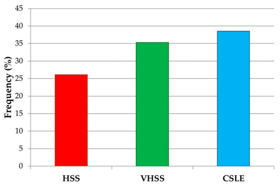 Based on this double-level classification, about 25% of the whole set of analyzed events were classified as HSS, about 35% as VHSS, and about 40% as CSLE (Figure 5). Furthermore, 63% of HSS and 52% of VHSS occurred in SON season (in particular in September and October), while more than 50% of CSLE were observed in JJA season (mainly in July and August) (Figure 6 and Figure 7).